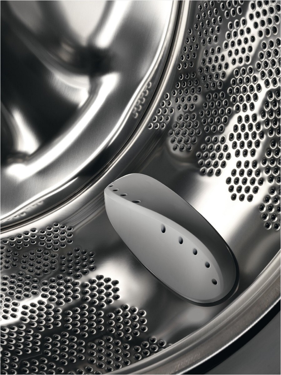 Die AEG-Schontrommel verfügt über eine besondere Kissenstruktur mit sanft abgerundeten Öffnungen und Mitnahmerippen. Deine Textilien gleiten behutsam wie auf einem dünnen Wasserfilm und werden auf diese Weise schonend und energieeffizient bei einem reduziertem Geräuschpegel gewaschen.